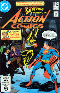 These pages alternate between images of the superhero Vixen running near an airport, and a fox fleeing from a group of hunters and hounds. A vixen refers to a female fox. The character Vixen first appeared in Action Comics #521 (July 1981) [pictured]. She was actually created with the intention of having her own series in 1978, but the first issue and series was cancelled as part of the “DC Implosion”, where struggling sales forced the sudden cancellation of more than a dozen titles. In her first published appearance, Vixen is the alter ego of fashion model Mari Macabe, and in that issue she teams up with Superman to stop the illegal trade of animal furs.