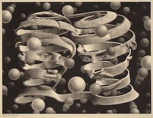 The letters relate to Animal Man #10. Some readers begin to understand the implications of Psycho-Pirate remembering the events of the Crisis, which makes him part both of the DC Universe and spectator above it. The third letter writer also notes that Bolland’s cover for issue #10 owes a debt to M.C. Escher, perhaps referring to Escher’s Bond of Union illustration from 1956 [pictured].