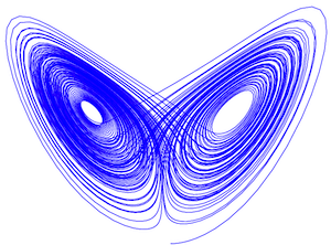 The shapes around the mesa recall the Lorenz attractor – a graphical representation of three equations proposed by Edward Lorenz initially to calculate an atmospheric condition known as rolling fluid convection. Putting any parameters into the equation results in a chaotic system that is infinite and never-repeating. Any slight change to the parameters returns a wildly different result – what Lorenz referred as as the “butterfly effect” (see the previous issue, page 17, for an explanation of the popular usage of that phrase). The Lorenz attractor is often said to resemble the wings of a butterfly [see picture].