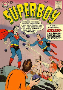 This is Bizarro, who first appeared in Superboy #68 (Oct. 1958) [pictured] as an imperfect and “dimwitted” duplicate of Superboy. An imperfect duplicate of Superman is also created in Action Comics #254 (July 1959). In Action Comics #263 (Sept. 1961), Bizarro makes many imperfect copies of himself and Lois Lane and they settle on an uninhabited planet, where they establish a culture and language that is opposite to Earth in many ways. Bizarro appears in the background of the previous panel saying “Goodbye”, which in his language means “Hello”. From Adventure Comics #294 (Mar. 1962) onwards, the logo on Bizarro’s costume was a mirror version of Superman’s ’S’, though in this issue he wears the same costume as Superman. Bizarro’s post-Crisis appearance in Man of Steel #5 (Dec. 1986) establishes a new origin story and kills the character within the same issue, which may be why he appears here amongst the other resurrected characters.