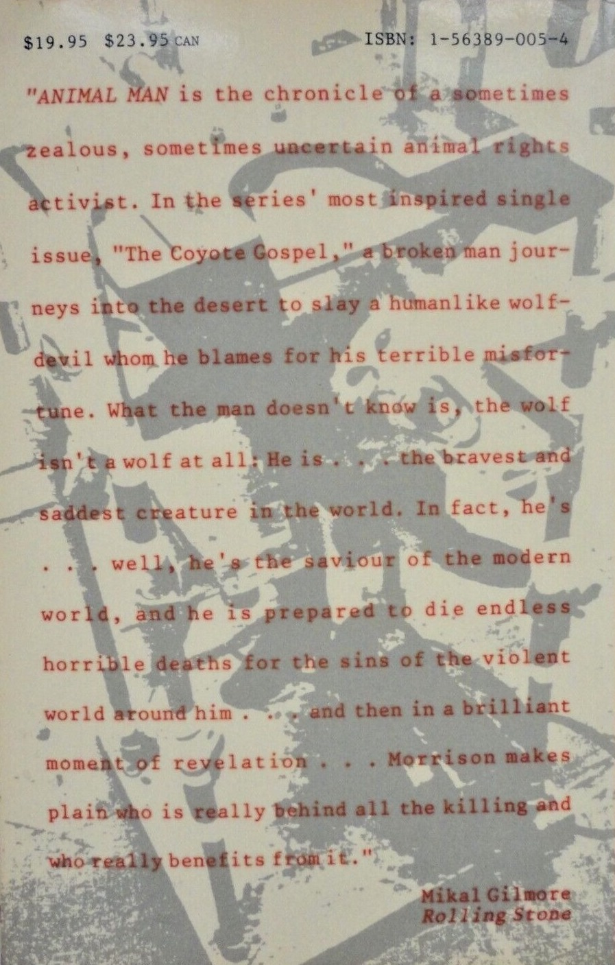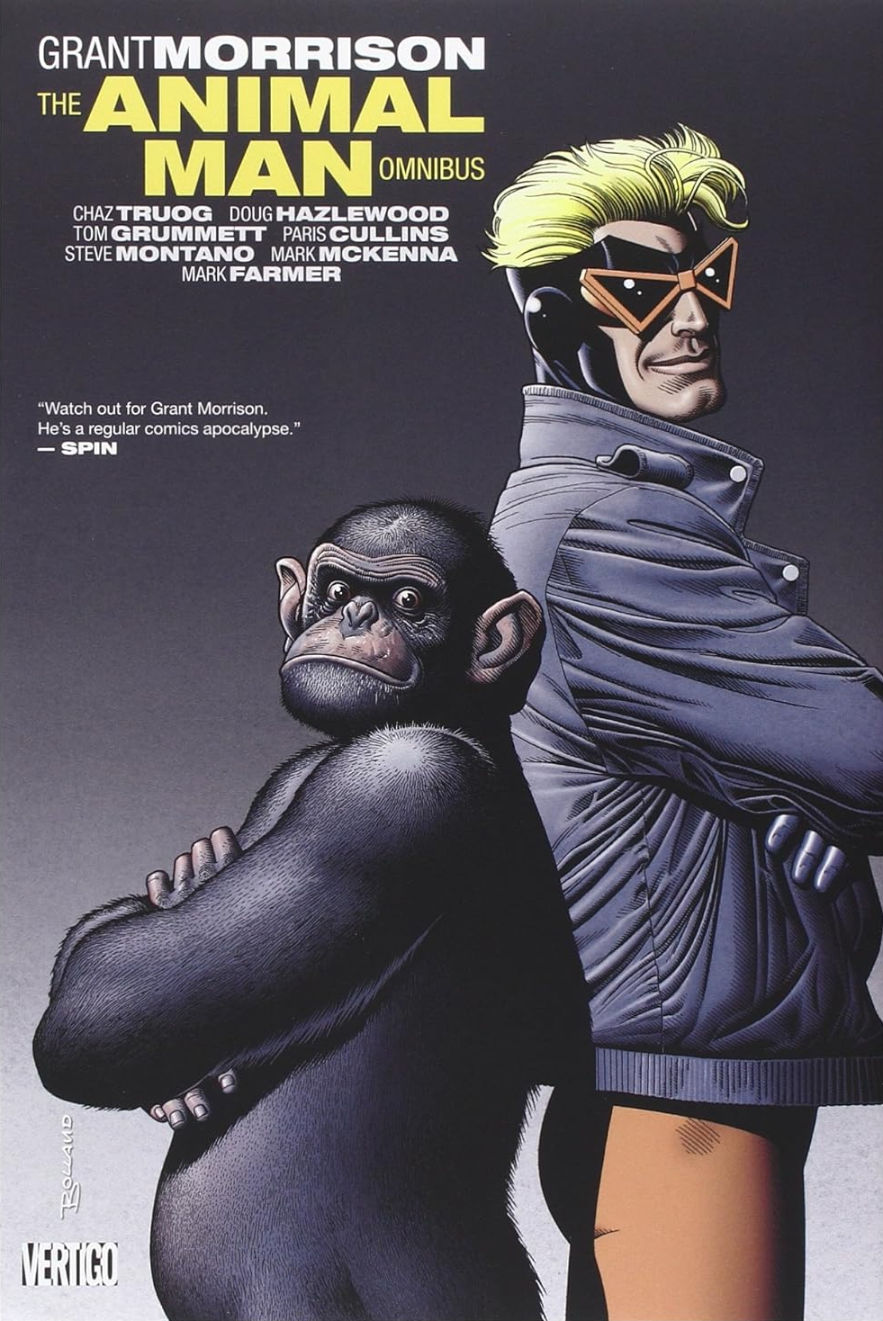 This book collects issues #1-#9 of the Grant Morrison run. The first printing from 1991 displayed the DC logo in the top left corner. The back cover included a Rolling Stone review over a 1981 image of a primate that was supplied by PETA (People for the Ethical Treatment of Animals). It is likely an image of one of the ‘Silver Spring monkeys’ from the Institute for Behavioral Research lab in Maryland.